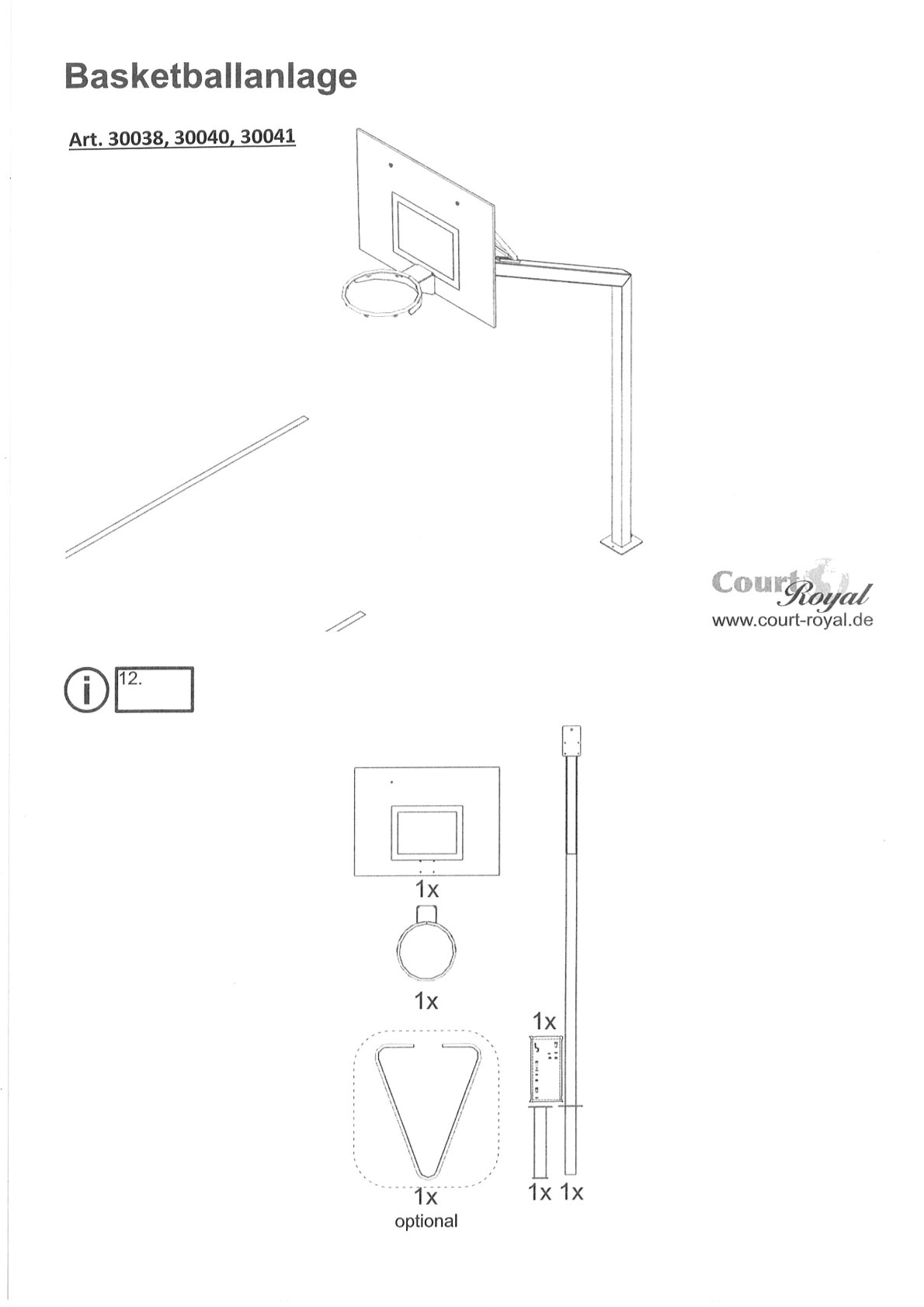 Basketballanlage mit Glasfaserverstärktem Kunststoffbrett Ein stabiles, feuerverzinktes Stahlrohr-Quadrat-Profil mit den Dimensionen 90x90x4 mm, kombiniert mit einem abgerundeten GFK-Brett mit den Dimensionen 120 x 90 cm macht dies zu einem Court Royal Spitzenprodukt. Die Korbhöhe ist auf einer Wettkampfhöhe von 305 cm angebracht und ist nicht in der Höhe verstellbar. Über das Drop-down Menü kann eine Ausladung von 120 cm oder 165 cm ausgewählt werden und ist daher für alle Altersklassen geeignet. Daher eignet sich diese perfekt für öffentliche Einrichtungen wie z.B. Schulhöfe, Spielplätze und Vereine. Die Säule wird der mitgelieferten verzinkten Bodenhülse in den Boden einbetoniert und steht sicher und vandalismussicher. Zusätzlich ist im Lieferumfang ein orangefarbener DIN-Korb mit einem 6 mm Nylonnetz.  Sicherheit nach TÜV und GS geprüft  Diese Basketballanlage ist GS-geprüft und nach den funktionellen und sicherheitstechnischen Anforderungen der DIN-Norm EN 1270 hergestellt. + Besonderheiten: Einmastkonstruktion mit direkter Anschraubplatte für den Korb (90x90x4 mm) Made in Germany Bodenhülsen feuerverzinkt Qualitatives GFK-Brett TÜV und Intertek GS-Siegel