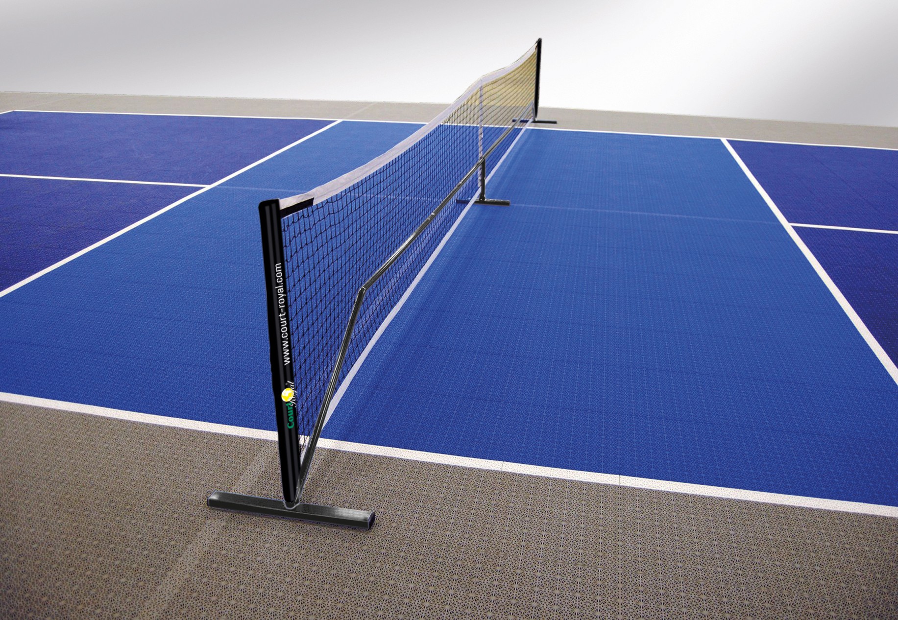 The installation of the tiles is simple and straightforward and can easily be carried out by the customer. The total court size is 16.55 x 9.30 m, while the actual playing area measures 13.42 x 6.17 m.
