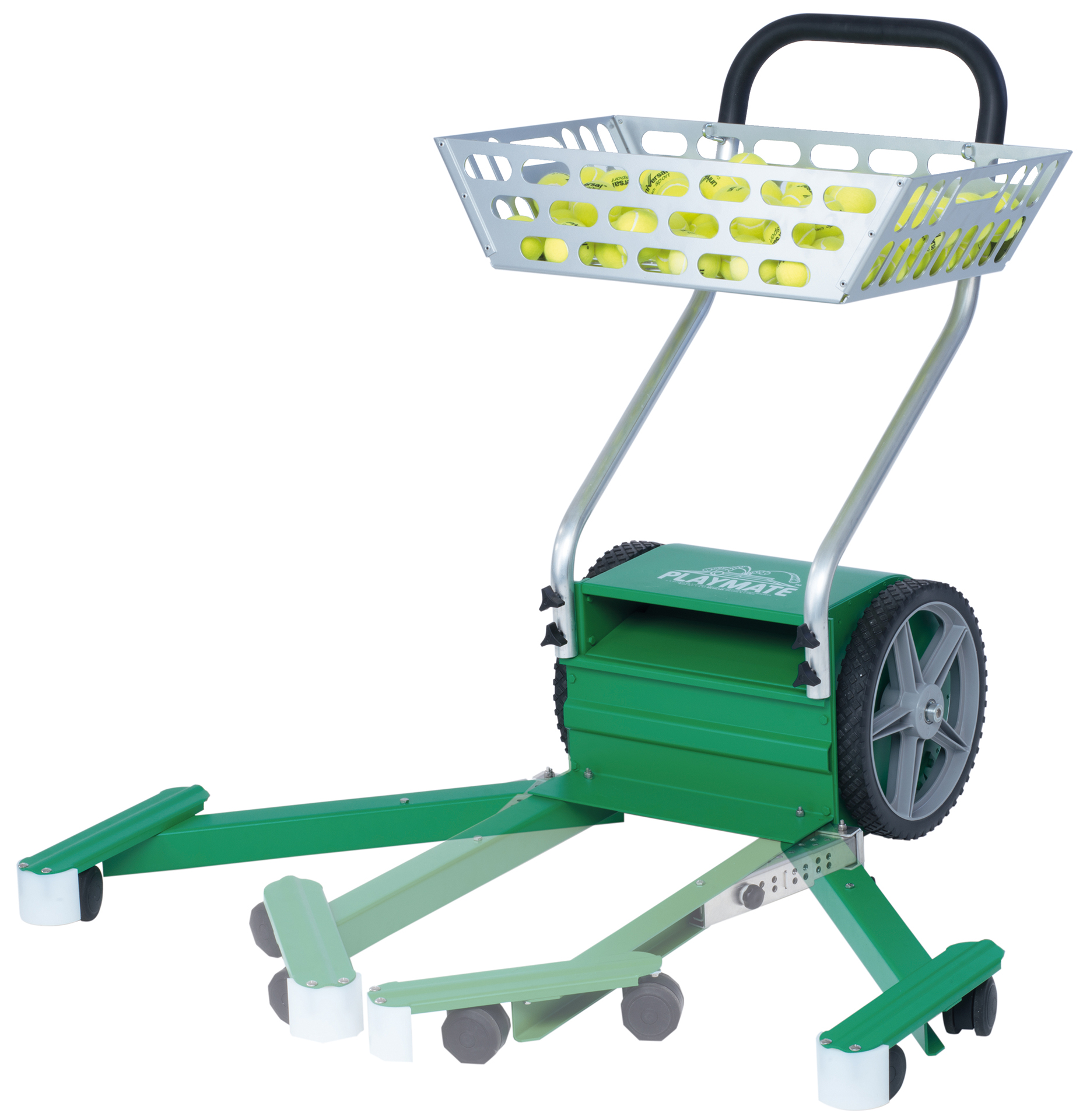 Dieser neue Ballsammelwagen sammelt in kürzester Zeit die über den Platz verteilten Bälle. Der Aufnahmekorb kann leicht abgenommen werden und in den Ballwagen oder in die Ballmaschine geleert werden. Die Auffangarme sind einklappbar. Hochwertige Alukonstruktion mit großen Laufrädern. Der Korb kann zum Abspielen der Bälle am Griff eingehakt werden.