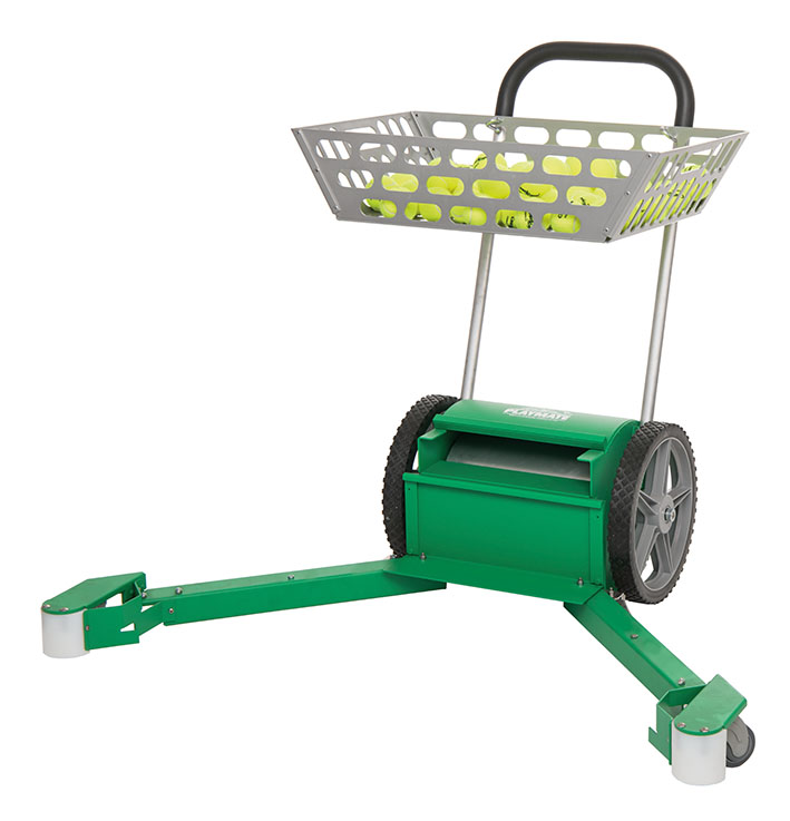 Dieser neue Ballsammelwagen sammelt in kürzester Zeit die über den Platz verteilten Bälle. Der Aufnahmekorb kann leicht abgenommen werden und in den Ballwagen oder in die Ballmaschine geleert werden. Die Auffangarme sind einklappbar. Hochwertige Alukonstruktion mit großen Laufrädern. Der Korb kann zum Abspielen der Bälle am Griff eingehakt werden.